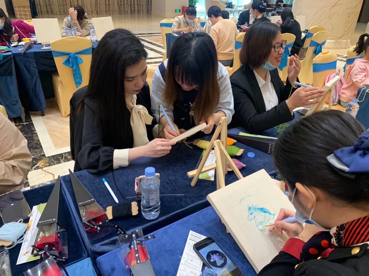 在老师的细心指导下,在场的女员工都专心地完成着自己的作品,将原本平平无奇的白布增添了独具特色的刺绣作品。